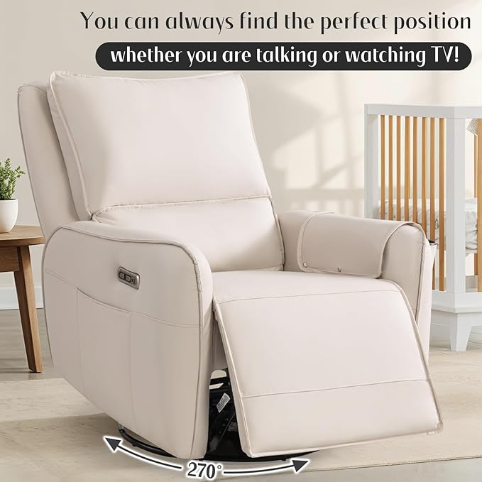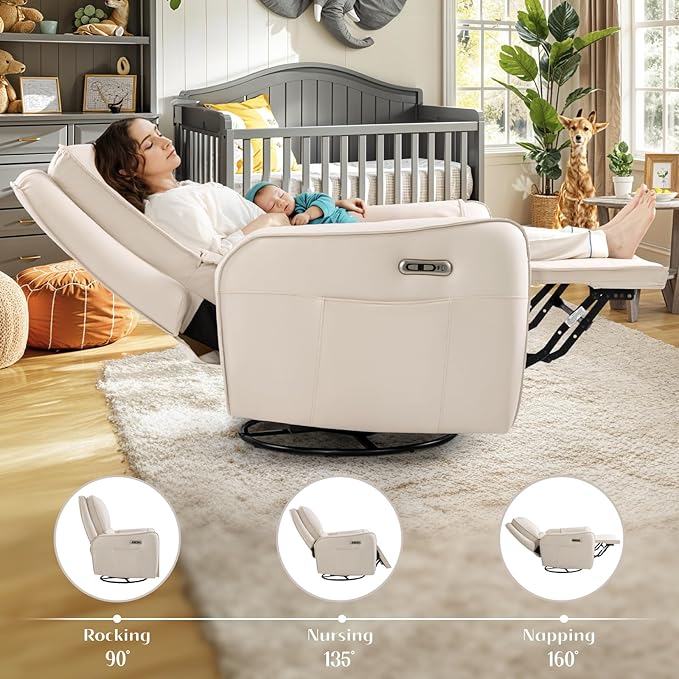 - Power Swivel Glider Recliner: Rocking and reclining are the most desired features of a nursery glider, meanwhile it can also swivel. With our swivel rocker recliner, you can rock your little one gently to sleep, shift your direction to reach for something, or get out of the recliner chair conveniently. You can also press the electric button to make this chair recline to a more comfy position for a sweet nap.