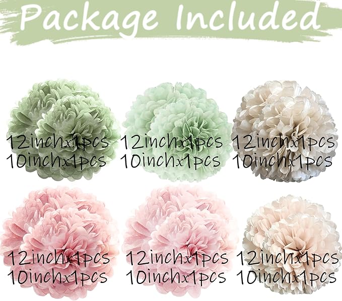 Tissue Paper Pom Poms Kit -Rose Pink and Sage Green Paper Flowers 12pieces for Gender Baby Shower Wedding Bridal Bachelorette Birthday Party Decorations (Green + Pink)