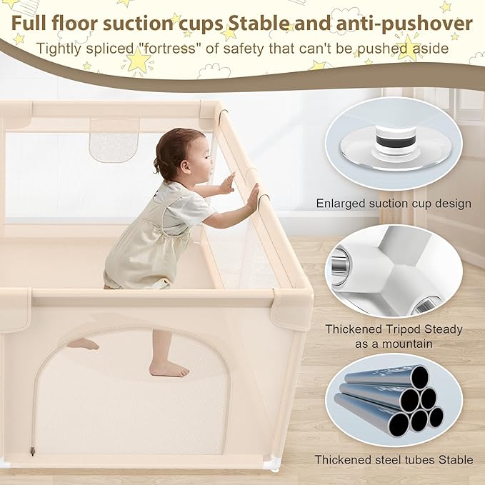 - 【EASY TO INSTALL AND STURDY STRUCTURE】 The extra large playpen is easy to install, no tools are needed, just follow the instructions and it can be installed in 10 minutes. The structure of the baby playards is sturdy, using slot or suction cups and other designs to ensure the stability of the baby's movement within the baby playpen. Baby Gate Playpen are often designed to prevent babies from reaching unsafe places in the home, such as stairs and electrical appliances, thus minimizing the risk of accidents.
