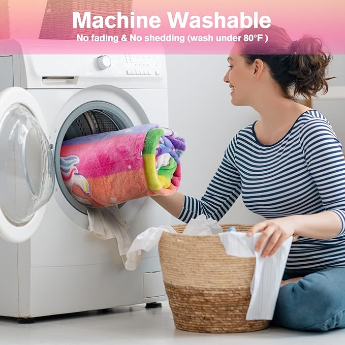 - Premium Material - The luminous unicorn blanket is made of high-quality polyester fiber. The skin-friendly fine fiber plush flannel cozy blanket provides extra softness and comfort for all girls, boys, teenage kids and adults. Lightweight and warm. Kids Unicorn blankets and throws is also a perfect lap blanket and bedroom nap blankets, suitable for using on sofas, couches, beds, car journeys, outdoor travel camping or home decorations, and provides you with comfort and softness in all seasons