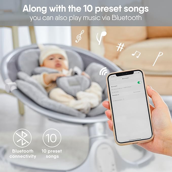 - Baby Swings for Infants to Toddler: The BabyBond baby swing features 3 seat positions, 5 natural sway motions, 10 preset songs, and Bluetooth options, ensuring quick calming and relaxation for your baby. It is best suited for toddlers aged 0-12 months and weighing up to 27 pounds