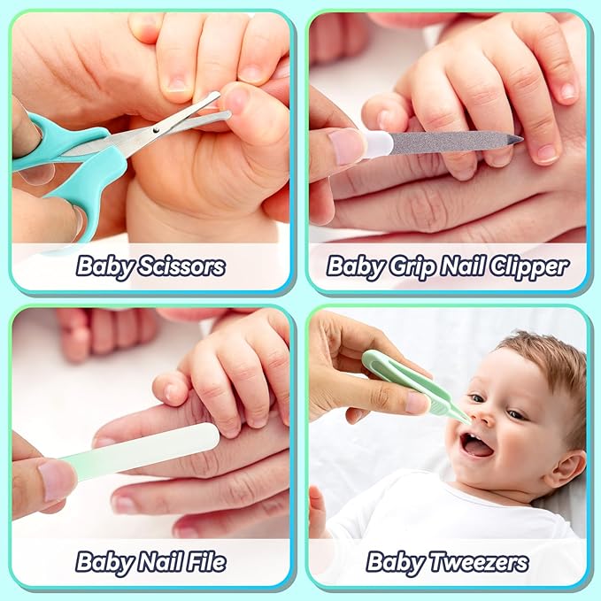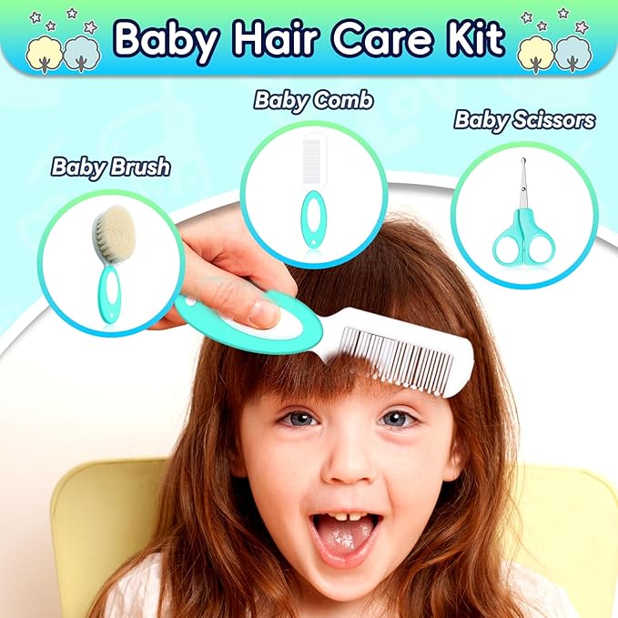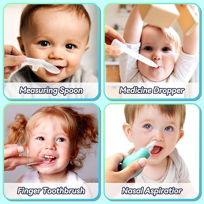 - 【SPECIALLY DESIGNED FOR BABY】1. Grooming set: scissors with round blades, round teeth, comb with soft brush and silicone brush, gentle and non-irritating, suitable for baby's hair grooming and bath use; 2. Plastic tweezers, nasal aspirator and nail clipper with stopper to ensure baby's safety and comfort when using; 3. Dropper and measuring spoon with scale, convenient for you to measure the amount accurately, comfortable silicone finger toothbrush to clean baby's teeth and tongue.
