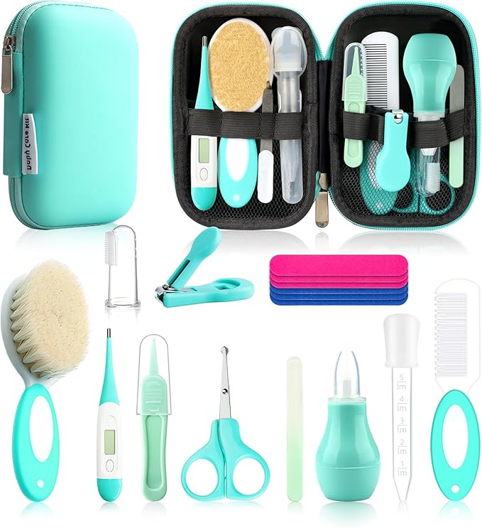 Baby Healthcare and Grooming Kit, Baby Safety Set Newborn Nursery Health Care Set with Hair Brush Scale Measuring Spoon Nail Clippers (17pcs, Green)