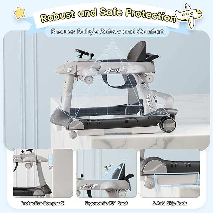 - 6-IN-1 CONVERTIBLE DESIGN: This versatile baby walker is designed for babies aged 6-18 months, assisting them in learning to walk and strengthening their leg muscles. It transitions through six modes: Parent Assist Mode, Self-Walking Mode, Dining Chair Mode, Push Walker Mode, Push Cart Mode, and Toy Airplane Mode. The engaging airplane design meets various developmental needs and keeps your baby entertained.