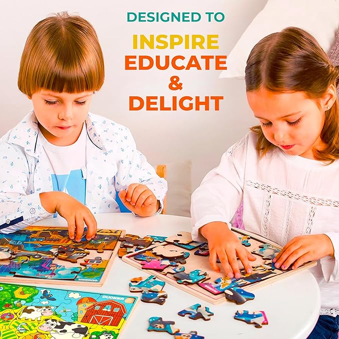 - UNIQUE WOODEN PUZZLE SHAPES: every jigsaw puzzle has 28 pieces puzzle shapes for kids to play with; We assemble them manually; Create fun learning games with Farm Animals; Great puzzles for kids ages 3-5 and up