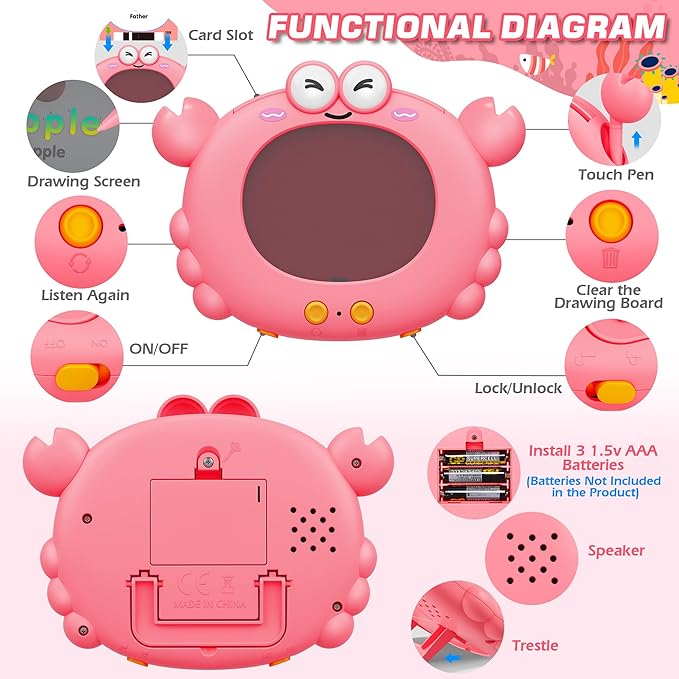 - Easy to use:Just turn it on, insert the card, and it will read aloud. The unique one-button cycle function allows for repeated listening without reinserting the card. Plus, the crab's pincers can be detached and used as a pen for writing letters, drawing, and other activities, making learning fun and interactive for children. Perfect for daily use at home or in educational settings.