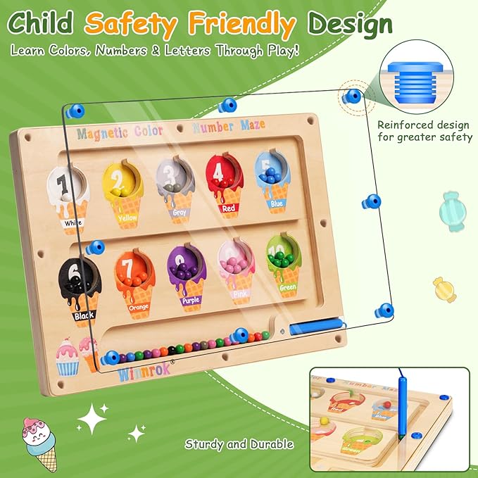 - Safe & Child-Friendly Design: This magnetic maze for kids ages 3-5 is made of extra-thick natural wood with non-toxic paints, specially treated smooth rounded edge corners, and a smooth acrylic surface to ensure your child won't scratch. The magnetic number and color maze broad surface is secured with 8 pins to ensure that the beads will not fall out and be swallowed by your child by mistake! The magnetic pen has appropriate magnetic power attached to the board and beads, which is easy to store and the beads have enough suction to be adsorbed