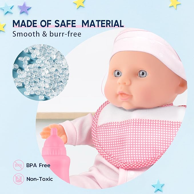- Washable Baby Doll Accessories: Wipe the soft baby doll with a damp cloth and wash its outfits with soap to make the toddler baby doll become clean and durable again