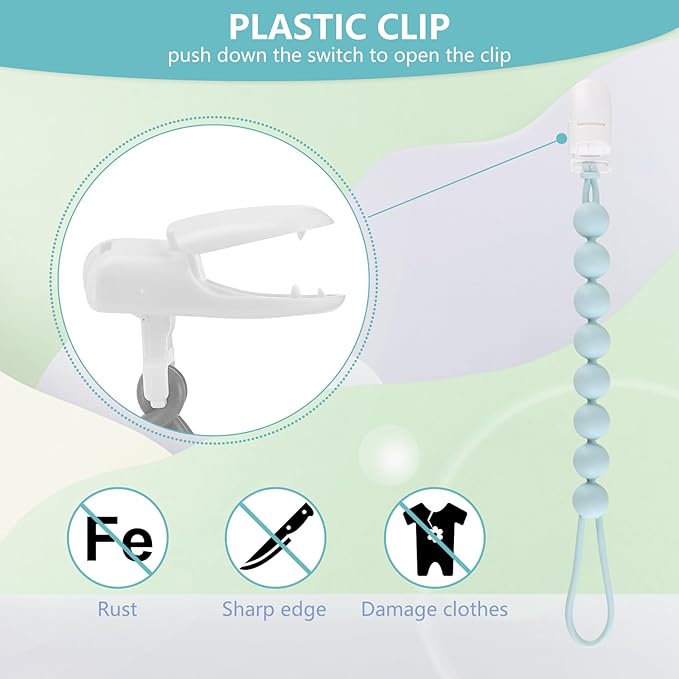 - Unmatched Quality & Safety: Crafted from rust-free plastic and 100% food-grade silicone beads, our pacifier clip is easy to clean and free from harmful chemicals. Trust in the quality and safety of our product for your baby's well-being.
