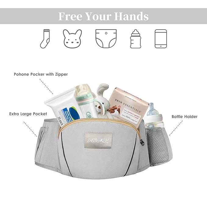 - Extra Large Capacity - Considering that parents may need to out for a long periods of time, Debark baby carrier newborn has designed four pockets. With large storage pockets beneath the seat, you can easily throw in diapers and wipes, making them easy to grab whenever needed. The side pockets are perfect for storing the keys, phone, and pacifiers, etc