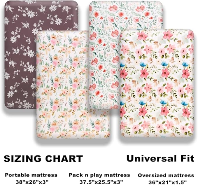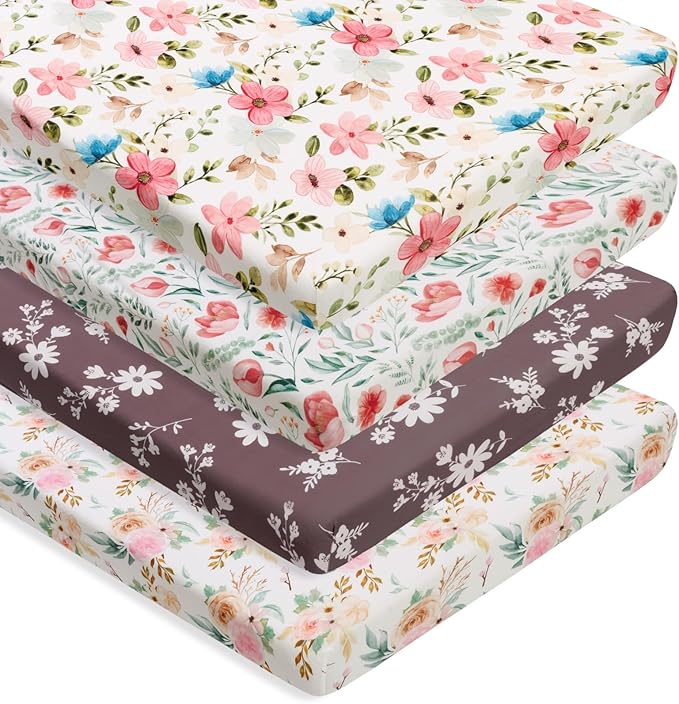 4 Pack Baby Girl Pack N Play Mini Crib Sheets Set Soft Fitted Floral Theme Baby Girl Mattress Covers Breathable Toddler Bed Sheets for Infant or Newborn(Flower, Pack N Play Mini Crib Sheets)