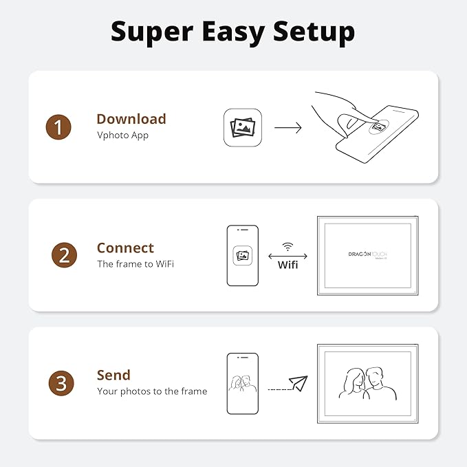 - 【Easy and Fast】- Set it up in 1 minute. This Wi-Fi cloud electric frame is user-friendly. All you need to do is connect it to Wi-Fi and log in. For this digital picture frame, pictures are loaded from phone via VPhoto App. Once you send photos to the frame, they display automatically.