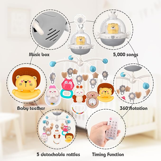 - Soothing Environment with Music and Lights: Our grey baby crib mobile offers a tranquil environment with soft music and gentle lighting, creating a soothing atmosphere that helps your baby relax and enjoy a peaceful sleep.
