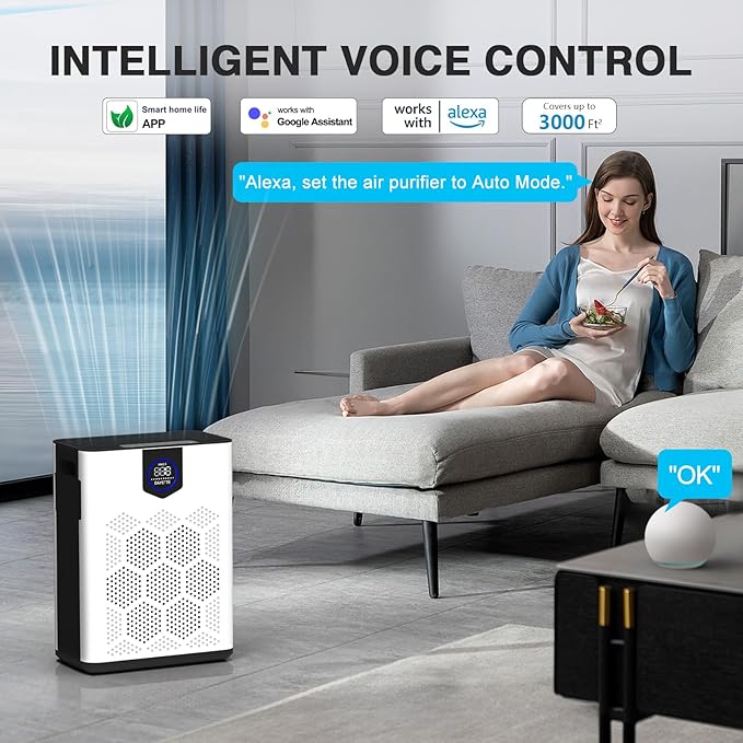 - ใ๐๐๐ง๐๐ฌ-๐๐ซ๐๐ ๐ฏ๐จ๐ข๐๐ ๐๐จ๐ฆ๐ฆ๐๐ง๐ใHands-free voice command: DAYETTE smart air purifiers for home large room is compatible with Amazon Alexa and Google Assistant for hands-free control. Just give it a voice command and the air purifier will immediately perform the corresponding operation. Super convenient to operate when you leave it or your hands are occupied by housework