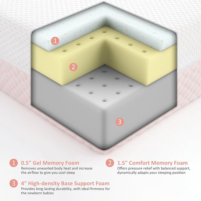 - 【Breathable & Comfortable Mattress】 Integrated with Gel-infused memory foam, open-cell memory foam and high-density support core, the triple-layered mattress helps to regulate temperature by accelerating air circulation and transferring unwanted heat away from the body, giving your baby a cool and comfortable sleep environment, thus ensures a through-the-night sleep