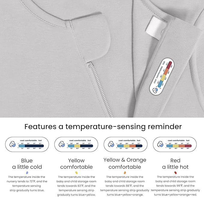 - Temperature Sensing Strip - Exclusive Design by Kaiya Baby. Our clothing features an internal temperature sensing strip located at the chest area. This strip displays the surface temperature where the product contacts the skin, allowing parents to adjust the baby's clothing based on temperature changes without physically touching the baby, ensuring a peaceful sleep.
