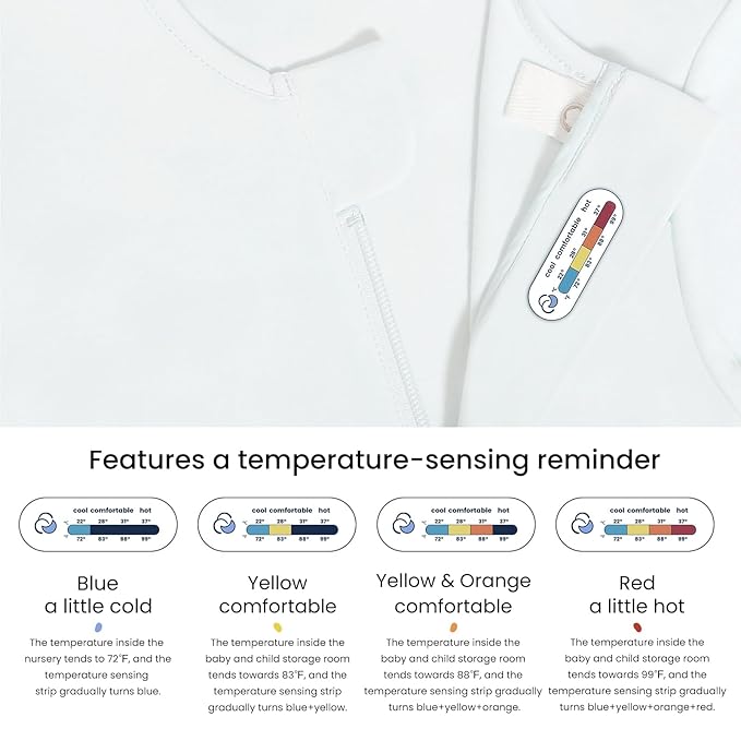 - Temperature Sensing Strip - Exclusive Design by Kaiya Baby. Our clothing features an internal temperature sensing strip located at the chest area. This strip displays the surface temperature where the product contacts the skin, allowing parents to adjust the baby's clothing based on temperature changes without physically touching the baby, ensuring a peaceful sleep.