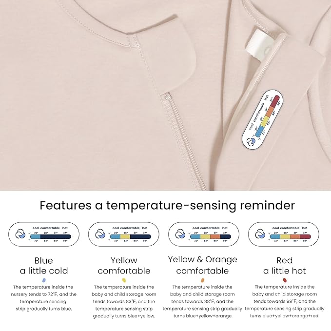 - Temperature Sensing Strip - Exclusive Design by Kaiya Baby. Our clothing features an internal temperature sensing strip located at the chest area. This strip displays the surface temperature where the product contacts the skin, allowing parents to adjust the baby's clothing based on temperature changes without physically touching the baby, ensuring a peaceful sleep.