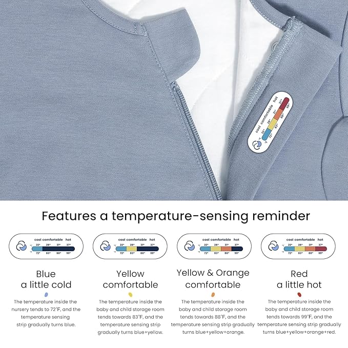 • Temperature Sensing Strip - Exclusive Design by Kaiya Baby. Our clothing features an internal temperature sensing strip located at the chest area. This strip displays the surface temperature where the product contacts the skin, allowing parents to adjust the baby's clothing based on temperature changes without physically touching the baby, ensuring a peaceful sleep.