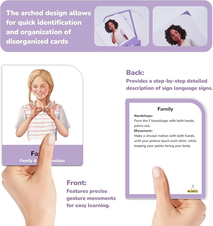 - Easy to Carry: Each ASL flash card measuring 5 x 3.4 inches, is crafted from durable cardboard designed for frequent use. The arch in the upper left corner of each card allows for quick identification and organization of cluttered sign language cards. The set includes an exquisite felt storage bag for convenient and elegant portability