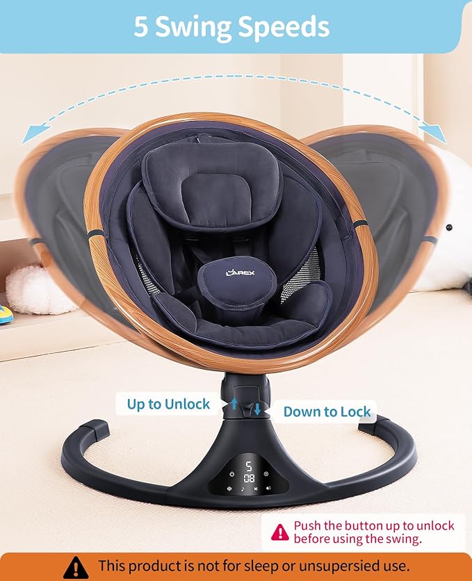 - 5 Swing Speeds:The swaying movement replicates the comfort of a mother’s embrace, offering 5 adjustable speed options to accommodate your baby’s preferences while providing mothers with arm-resting relief.