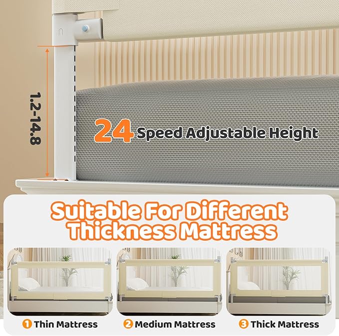 - 24 Speed Adjustable Height & Seamless Safety: With 24 adjustable heights to fit all mattress heights from 1.2 inches to 14.8 inches, it will fit your mattress perfectly. And it features a seamless press design that presses firmly into the mattress, eliminating the risk of babies‘ and toddlers’ arms, legs, or heads getting stuck and providing them with a safe and secure sleeping environment, making it a trusted choice for parents.
