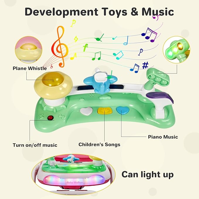 - Music & Toy Infant Walker: The baby walker and bouncer combo comes with music and toys, which will help stimulate your baby’s senses and accelerate their early development and help develop baby 's coordination and motor skills. Ideal walker for baby girl 6-18 months, perfect walker for babies 12-18 months