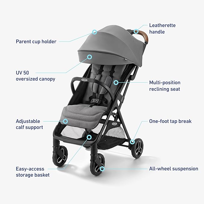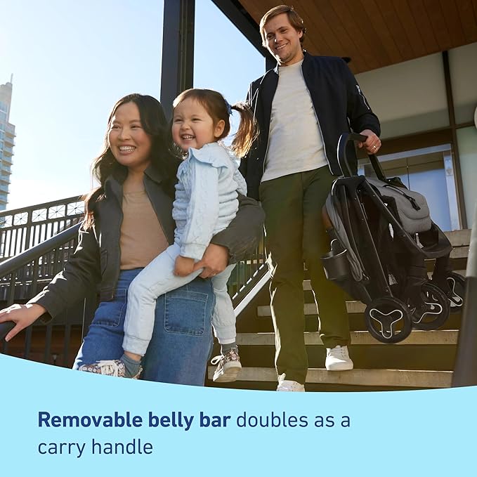 - Removable belly bar that doubles as a carry handle, stylish leatherette handle, UV 50 canopy, storage basket, and parent cup holder for easy, convenient strolling