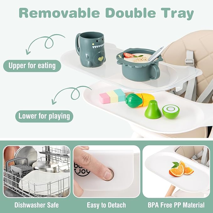 - Removable Double Tray: This infant feeding chair is equipped with a double tray that can be easy to detach according to your needs. The upper tray is suitable for eating and feeding, and the lower tray is ideal for playing. The tray is made of BPA free PP material and harmless to the health of your baby.