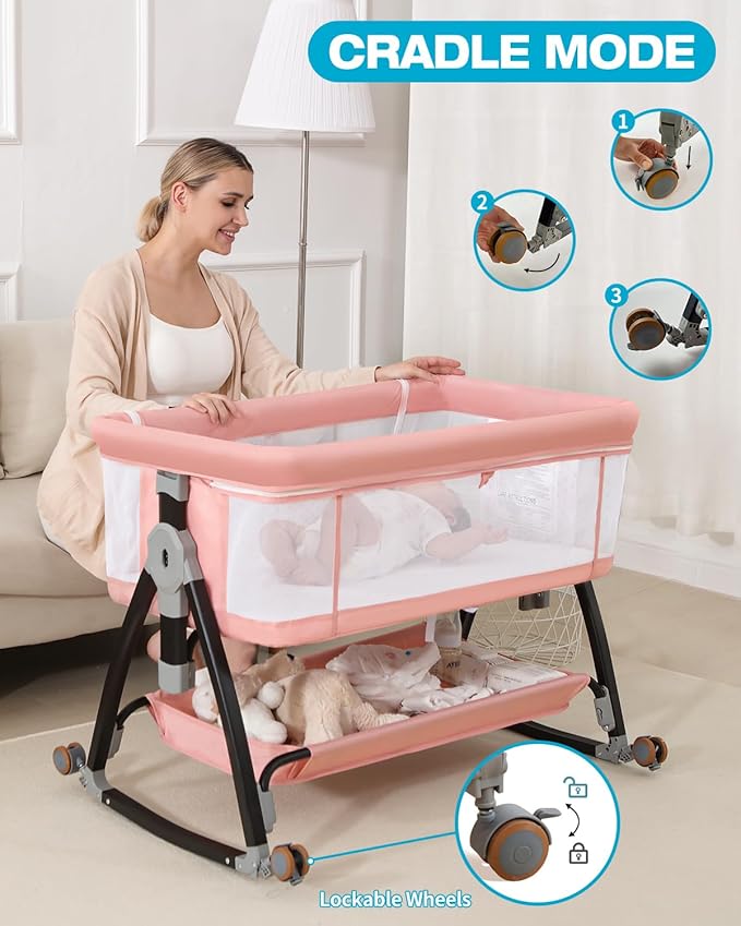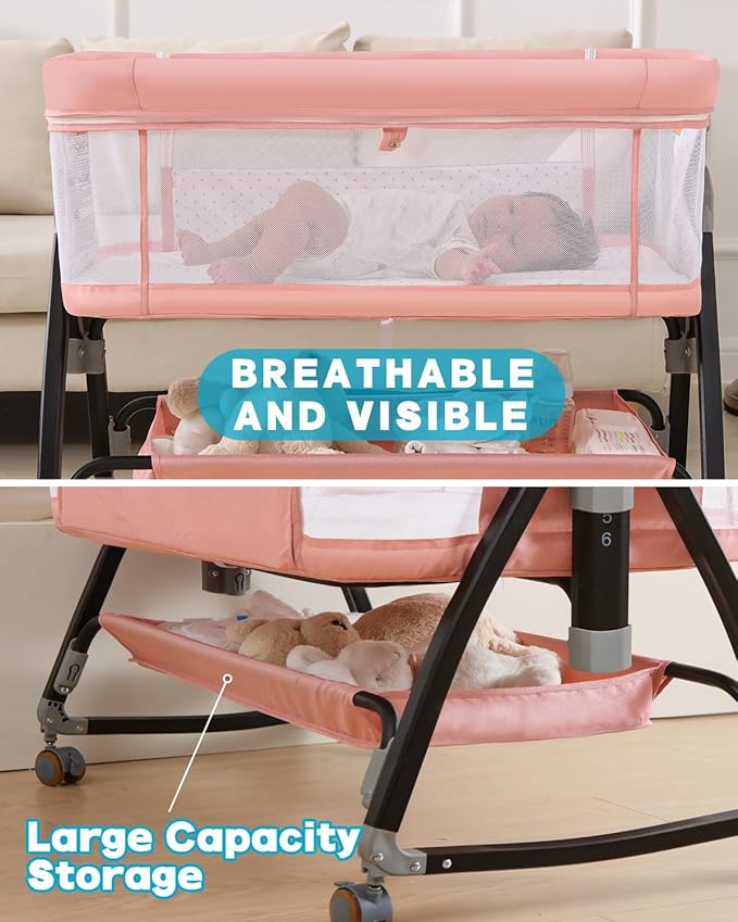 Bedside Bassinet for Baby, 3 in 1 Breathable Mesh Baby Bassinet, 6 Height Adjustable, Easy to Fold, Bassinet Bedside Sleeper with Wheels, Mosquito Net, Storage Basket, Rocking Bassinet for Baby, Pink