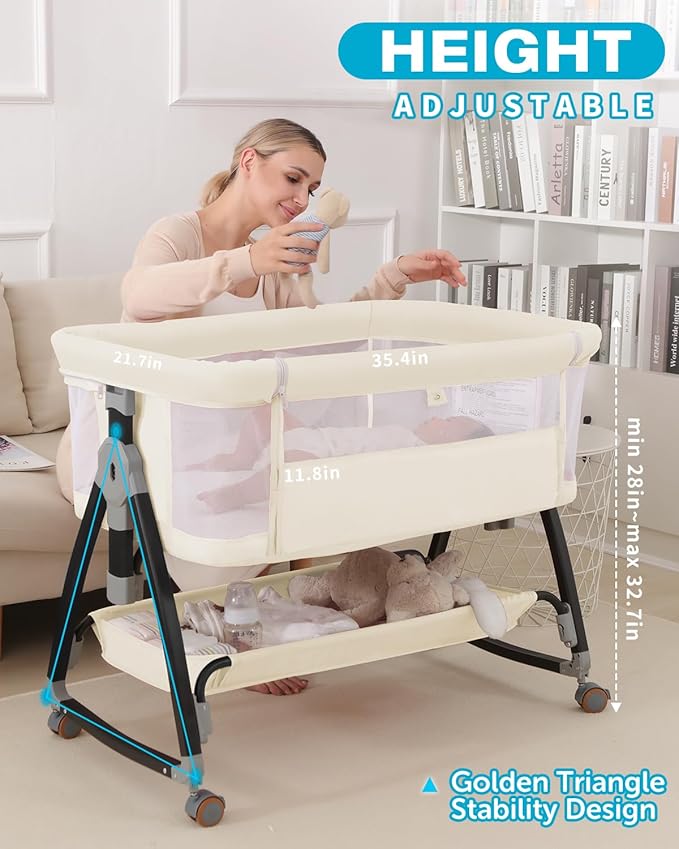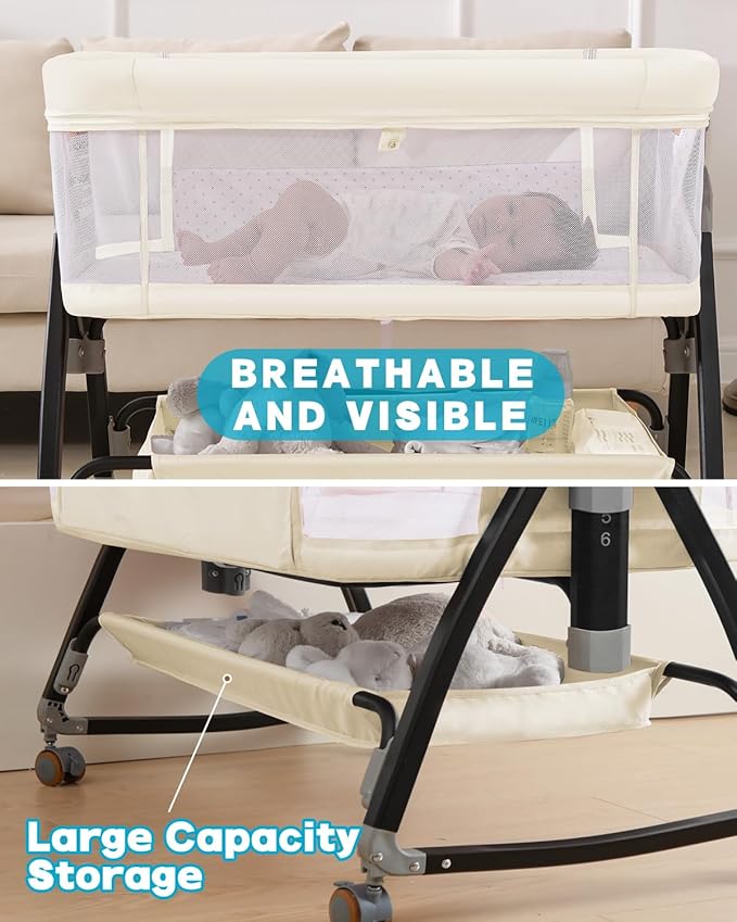 - Free Movement: Silent wheels with brakes of the baby bed provide safer and smoother mobility without damaging the floor. The storage basket underneath the bedside crib provides ample space for diapers, clothes, and other baby essentials