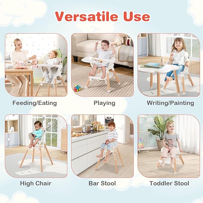 - 【6-in-1 Baby High Chair】This 6-in-1 HONEY JOY baby high chair can be converted to 1) full-size mealtime high chair; 2) high chair to dining table; 3)high bar stool; 4) mini meal chair with food tray lowered to the floor; 5) stand-alone floor chair with padded cushion; 6) kids ordinary chair, fully meeting babies needs ages 6 months - 6 years old and accompanies babies’ growth.