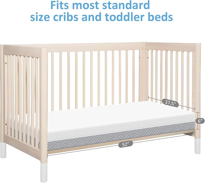 - 【Standard Size Crib Mattress】 Dourxi crib mattress is compressed and transported in a lightweight, portable box for ultimate convenience; for optimal performance, unroll your mattress and allow at least 72 hours for proper expansion in a room temperature setting. Dimensions of 52 x 27½ x 6 inches, the mattress fits any standard crib, convertible crib and toddler bed