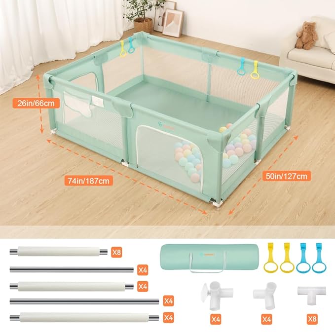 - [Baby's Own Play Space]: Our baby playpen measures 74x50x26 inches. The play yard fit the baby from 0 to 6 years old. The baby fence provides mini basketry, which can develop the grasping ability of your baby. And 4 four pull rings are equipped for your baby to stand and toddle. The playpen for toddlers entirely belongs to your baby, fully respecting the baby who already has self-awareness. The area is large enough that allows you to keep your babe company to play and read.