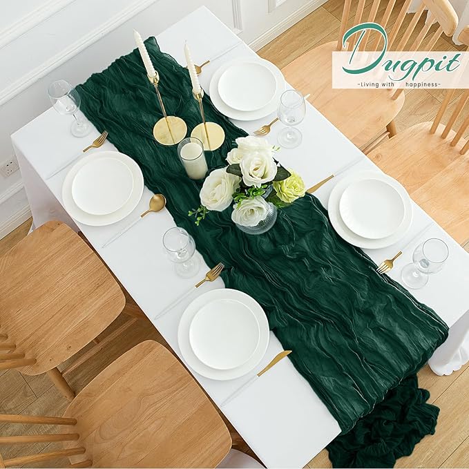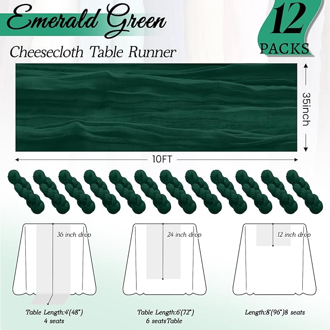 - Package Included:You will get 12 pack of green table runner, perfect for wedding banquets and various parties, enough to meet your daily use and replacement needs. Each emerald green cheese cloth table runner measures approximately 35 x 120 inches/90 x 300 cm, long enough to be used individually on rectangular and round tables, or pieced together for long tables. No matter how it is used, this gauze table runner can be placed perfectly and elegantly on the table or hung on the floor, adding a romantic atmosphere to your occasion
