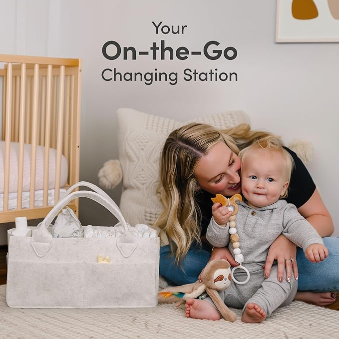 - STYLISH BABY ROOM DECOR ITEM - Our 15x9x7 storage caddy organizer has plenty of space for all your newborn essentials you need close by. The versatile nursery organizer diaper stacker diaper caddy has 8 external pockets and 3 compartments.
