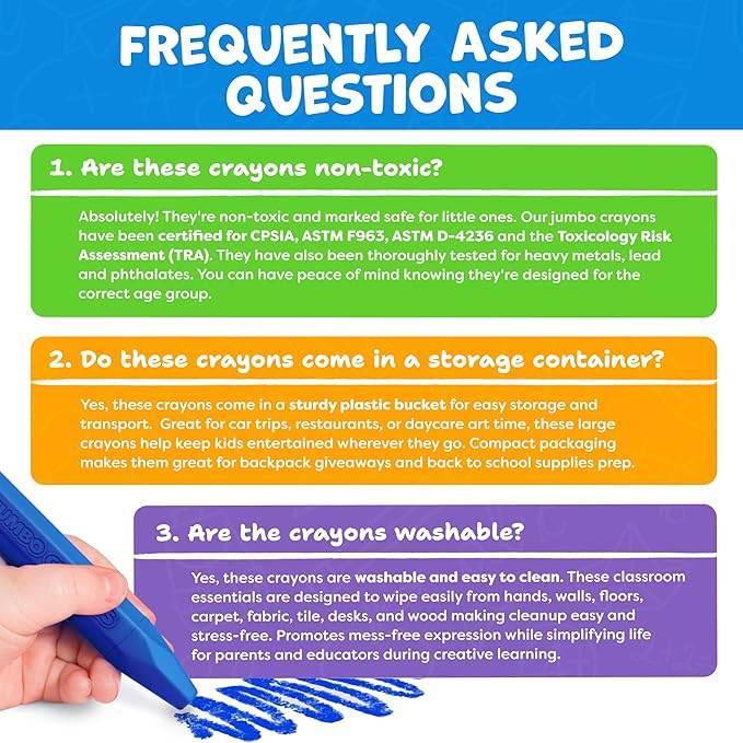 - Vibrant Colors That Are Non-Toxic & Safe. These premium big crayons toddlers color easily and vibrantly on paper and are certified safe for kids β lead-free, phthalate-free and meet ASTM D-4236, ASTM F963 and Toxicology Risk Assessment standards. Parents can relax knowing their little ones are safe while they explore creativity and color with confidence and ease.