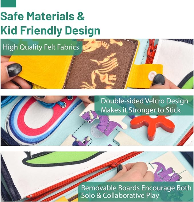 - Upgraded Features: Designed with a full zipper to keep everything safely inside. There is a fun removable T-Rex Buddy to explore each page with your child. The pages are specifically designed to correlate with eachother for easy learning, and has double-sided velcro for secure sticking. Plus, there is a scan feature to join our social media community of parents sharing ideas to engage and teach your little ones.