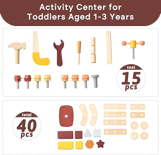- Inspire Imagination with 40 Tools: Give your child the freedom to explore and create. This activity center includes a full set of child-friendly tools—hammers, screws, and more—that will spark their imagination. As your toddler grows, they’ll transition from playing with you to building their own creations, developing confidence and independence along the way.