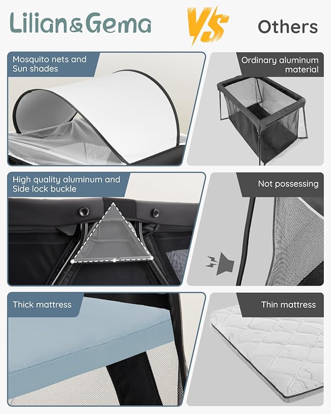 - Enhanced Outdoor and Travel Features: Our travel bed also comes with a UV50+ sunshade and a mosquito net, so you donโt have to worry about your baby getting sunburned or bitten by insects, even when you're outdoors