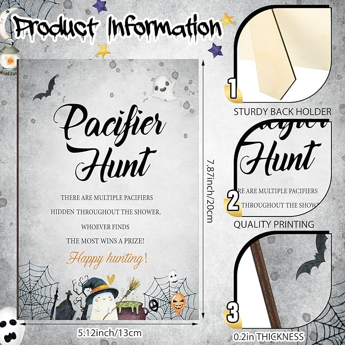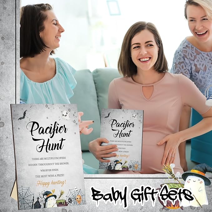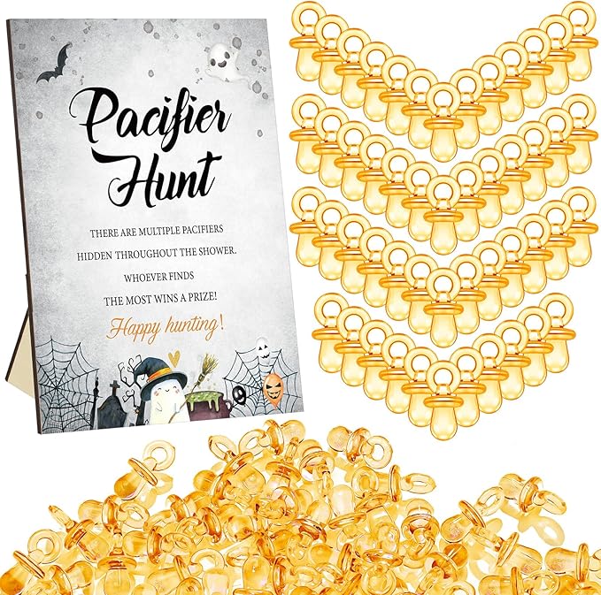 - Halloween Baby Shower Decorations: the Halloween baby shower games set contains 50 acrylic baby pacifiers and 1 pacifiers hunt wooden baby shower game wooden signage, enough for you to plan your baby's baby shower party and share it with your friends and family; The wooden signage is robust, ensuring it can be adapted repeatedly for different events; The included 50 pieces of acrylic baby pacifiers, featured in an orange color, add a festive and colorful touch to your baby shower game