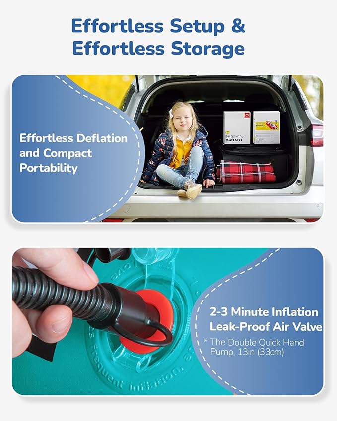 - Effortless Convenience: Use the equipped hand pump to inflate the kids travel bed to good work condition quickly. The innovative 2-in-1 inflation port design ensures an airtight seal, effectively preventing any pesky air leaks. Made from durable, thickened PVC material, it's built to last, ensuring your child enjoys countless nights of comfortable sleep.