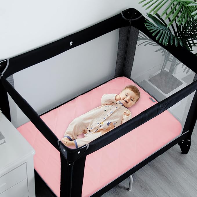 Pack and Play Sheets Fitted Waterproof Pack and Play Mattress Protector Pad Cover 2 Pack Pink Quilted 39" x 27"