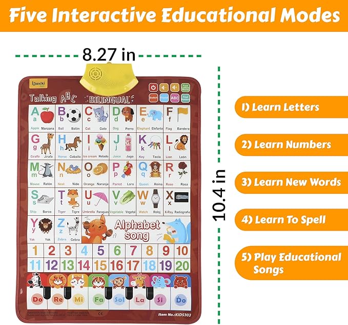 - Bilingual Learning Toy - Spanish & English: This interactive toy teaches toddlers and preschoolers alphabet sounds, new words, numbers, and spelling in both Spanish and English. Ideal for children ages 3-6, it’s perfect for early bilingual education.