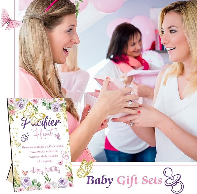 Thyle 51 Pcs Pacifier Hunt Baby Shower Games Include Hunt Sign and 50 Acrylic Pacifiers for Baby Shower Game Decoration Gift Sets Gender Reveal Party Decor(Butterfly)