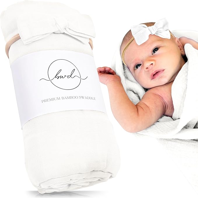BWD Baby Swaddle Blanket – Ultra-Soft 70% Bamboo Viscose & 30% Organic Cotton Muslin – Lightweight, Breathable, Stretchy – Newborn Essential 47" (White)