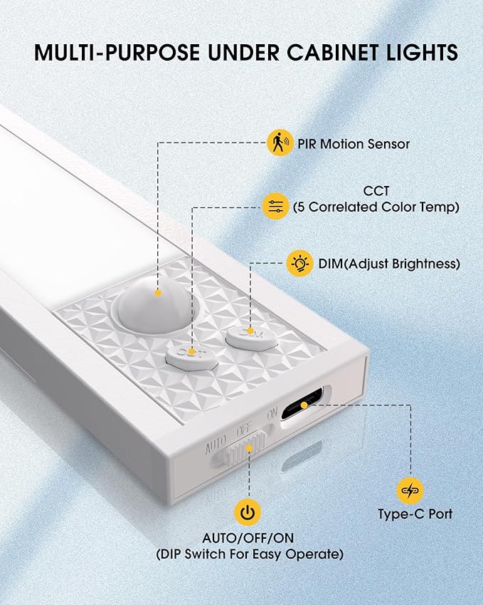 - Smart Motion Sensor lighting with 3 Modes - Featuring an advanced motion sensor, this under cabinet lighting detects movement within 10 feet and a 120Β° range in dark or low-light conditions. It automatically turns off after 25 seconds of inactivity. Choose from 3 lighting modes: Always-On, Always-Off, and Auto Motion Sensing, making it ideal for kitchen counters, closets, staircases, and hallways