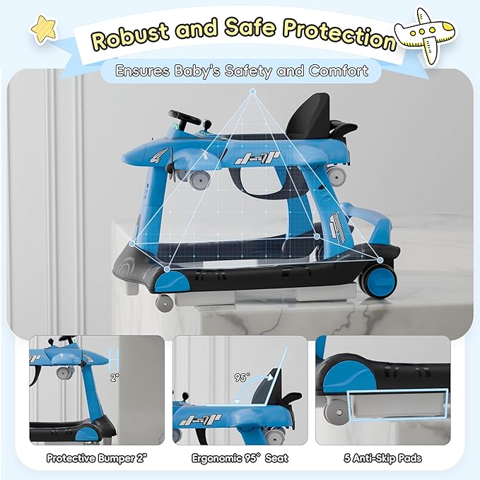 - 6-IN-1 CONVERTIBLE DESIGN: This versatile baby walker is designed for babies aged 6-18 months, assisting them in learning to walk and strengthening their leg muscles. It transitions through six modes: Parent Assist Mode, Self-Walking Mode, Dining Chair Mode, Push Walker Mode, Push Cart Mode, and Toy Airplane Mode. The engaging airplane design meets various developmental needs and keeps your baby entertained.