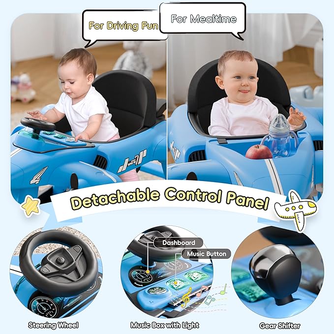 - MUSIC & LIGHT ACTIVITY CENTER: Featuring realistic airplane controls such as a steering wheel, shifter, rear-view mirrors, and light buttons, this walker offers an authentic piloting experience for your baby. Vivid music and lights stimulate your child's senses, making playtime fun and educational. The removable control panel doubles as a standalone toy or dining tray.