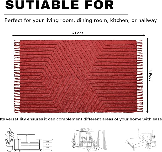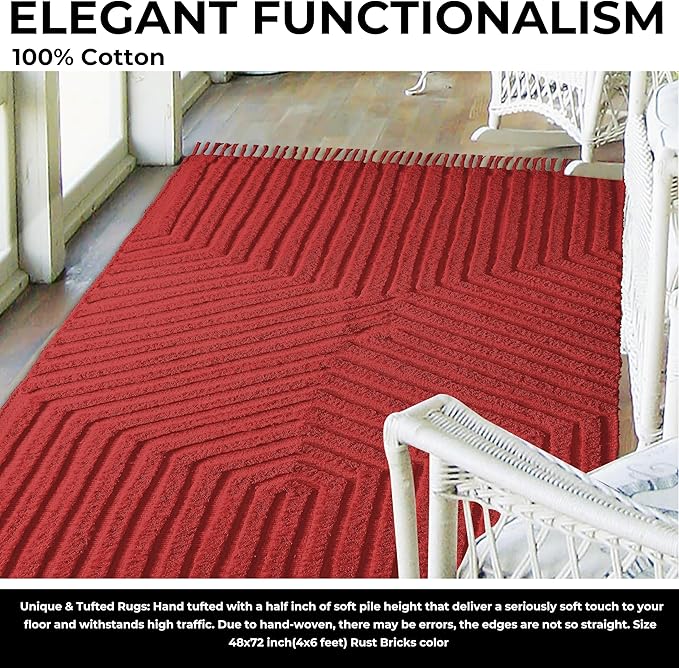 Boho Rugs for Living Room 4x6, Farmhouse Cotton Area Rug for Bedroom, Washable Tufted Indoor Floor Carpet for Kitchen Dorm Office Dining Room Office Home Decor, Rust Bricks